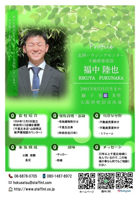 北摂ハウジングセンターTOP > 北摂ハウジングセンター スタッフ紹介 > 福中陸也の紹介ページ