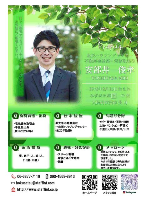 吹田で物件をお探しのお客様、私、安部井にお任せ下さい。今までの経験で得た知識が、